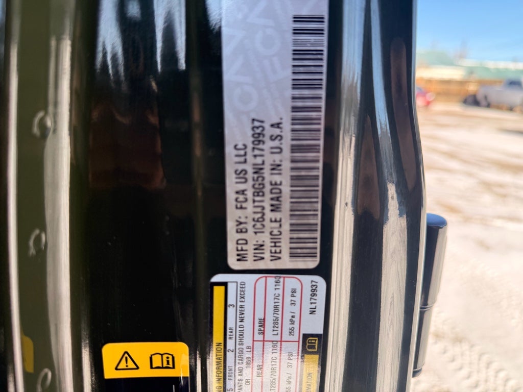Cold Weather Group: Remote Start System; Heated Front Seats; Heated Steering Wheel. LED Lighting Group: Daytime Running Lamps LED Accents; Front LED Fog Lamps; LED Premium Reflector Headlamps; LED Taillamps; LED Park Turn Lamps. Quick Order Package 24R. Trailer Tow Package: Heavy Duty Engine Cooling; Trailer Hitch Zoom; Class IV Receiver Hitch; 240 Amp Alternator. Auxiliary Switch Group: 700 Amp Maintenance Free Battery; Auxiliary Switches; 240 Amp Alternator. Body Color 3-Piece Hard Top. Leather Trimmed Bucket Seats. 17" X 7.5" Polished Black Aluminum Wheels. 2-Piece Body Color Fender Flares. Steel Front Bumper. Integrated Off-Road Camera. MOPAR Hardtop Headliner. MOPAR Spray in Bedliner. Remote Start System. Sarge Green Clearcoat. LT285/70R17C BSW Mud Terrain Tires. Corning Gorilla Glass. Jeep Trail Rated Kit. MOPAR All-Weather Slush Mats. **Equipment listed is based on original vehicle build and subject to change. Please confirm the accuracy of the included equipment by calling the dealer prior to purchase.**